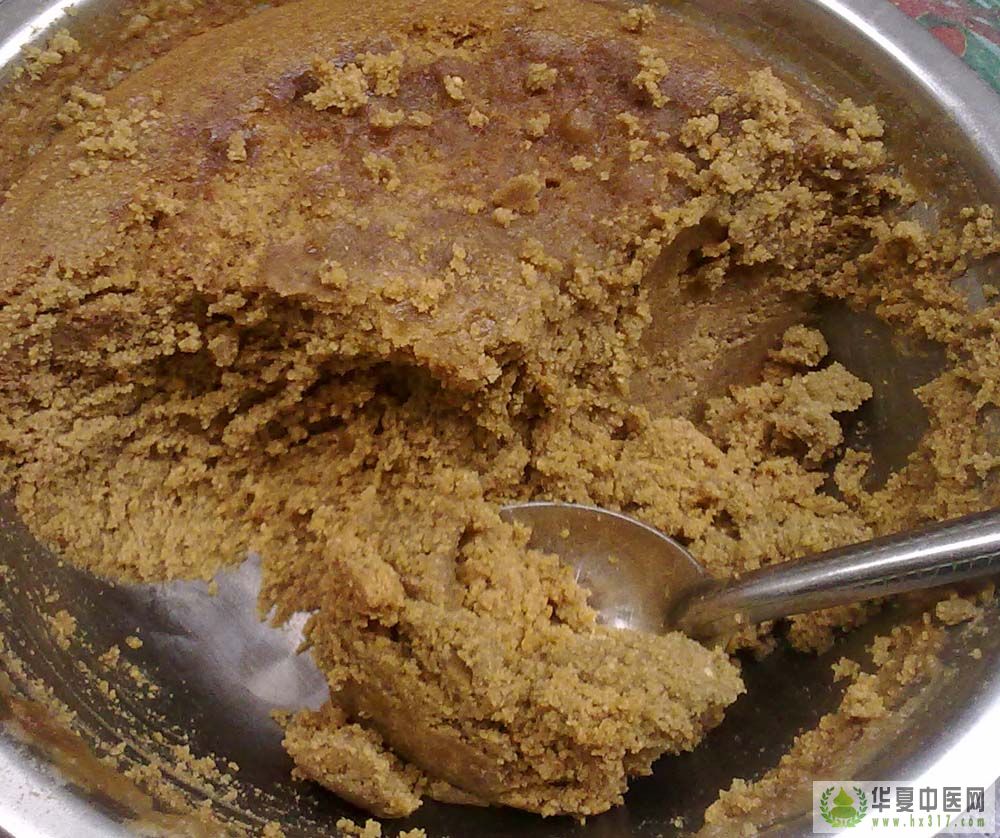 第二种我先倒一点蜂蜜慢慢加粉,搅拌,继续添粉。继续加蜜。拌成的效果细且颜浅,土黄色 -右图