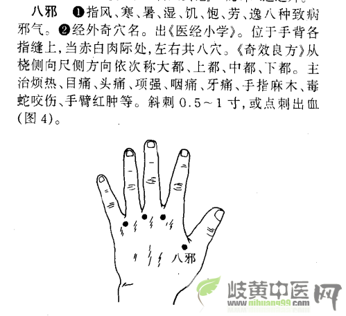 范 范武德 声名鹊起 正式会员 注册 2009/05/09 帖子 121 获得点赞 0 声望 0 2009/07/21 #6 我行针之“大都”穴,非足之大都穴,乃八邪之“断红”之穴,又称“大都”穴。此穴在二三指缝赤白肉间,向掌内平行进针一寸五分左右,强行针,得气留针半小时。