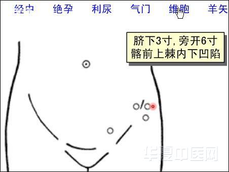【定位】:位于前正中线,脐下3寸,旁开6寸处,当髂前上棘内下方凹陷处。