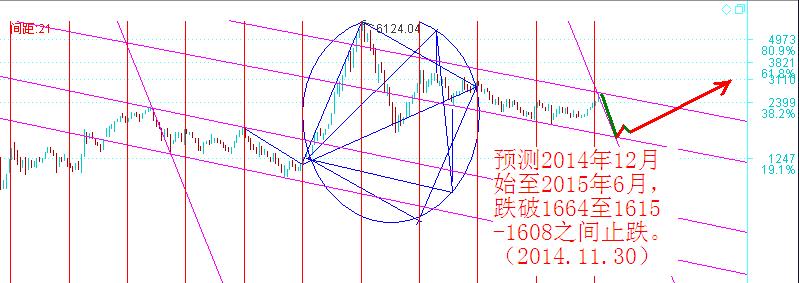 乘兴做上证指数月线江恩密码图,解释5个月来上证突破江恩圆形后下跌原因。依此图可知上证下跌最少还得16个月。