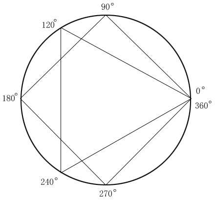 江恩将一个圆形三百六十度看为市场的时间及价位的循环,而三角形及四方形则在其中产生作用。