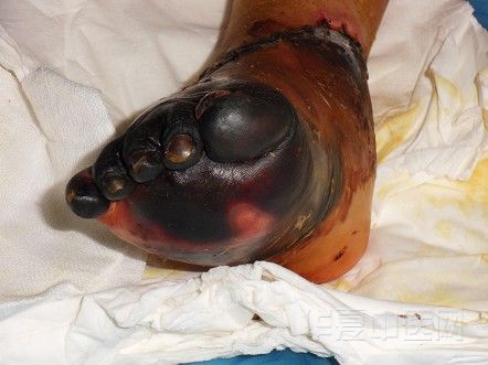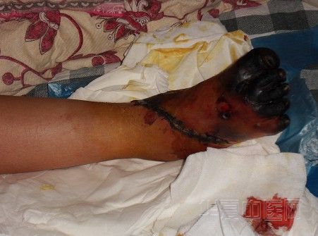 情况介绍及看后,我说,截肢,沒必要,但,已彻底坏死的部位保不住,根据我们的经验,只能保住脚掌,脚指头已保不住了,你们家长同意,我们就医;家长说,这是小孩一辈子的事,保住脚掌,还能穿鞋…..,不被截肢,我们就万幸了……. 。