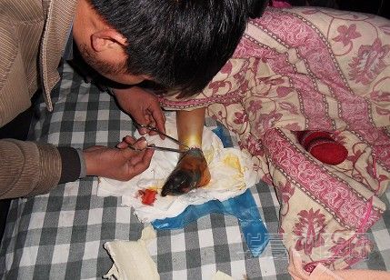 曾有一苗寨人,因打斗,左手掌合谷处被柴刀砍伤,大母指掉落不知去向,留下可见桡骨头至掌心部约10X5公分的创口,找到某苗医时,已化脓感染,整个手从肘手三里至掌指端严重赤热肿张,伤口流脓,皮肤色变,清洗后,可见白骨隐隐现露;当时,我认为此手只有截肢,否则可能无望,还有可能危及生命。