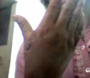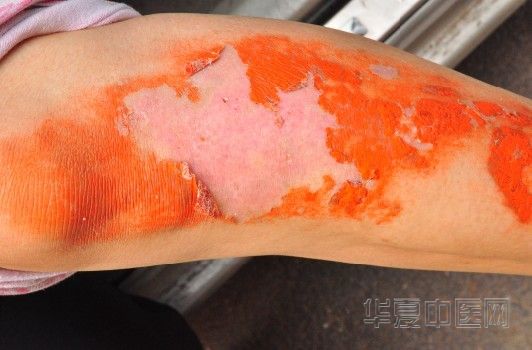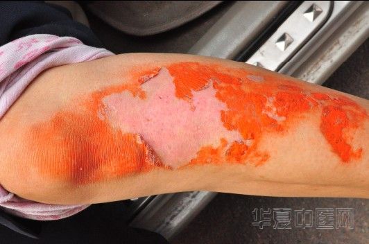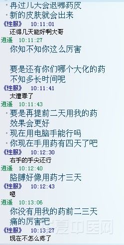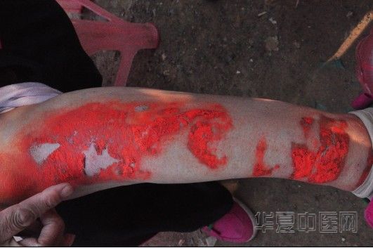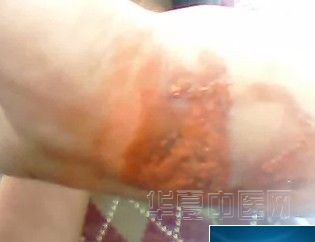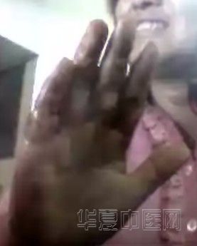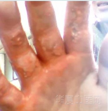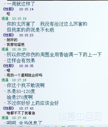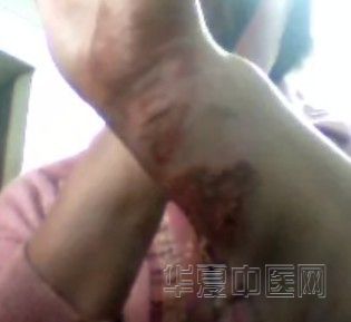 这个人是一周前在家熬猪油烫伤,因在农村,先使用大连大化医院的烫伤药,农村小医院有卖的,使用他们的药表面干了,但没有消肿,手胀的很痛,她老公是厨师,二天后在厨师群找到我,告诉他老婆在家烤猪大油,让油烫伤了,也没有告诉我多大,光和我要药了,当时我不知有多大,光告诉我是手烫伤,我就邮了一小瓶,也可能是病人家不太相信,就没有说多厉害多大,等收到药后先给手上了药,电话告诉我很热,边流水,因为伤的很厉害,流了有近三个小时,水冲掉了药就继续上药,晚上来电话说手大部分地方干了,干的地方凉不太痛了,这才相信我的药是好用的,和我说了很多客气的话,厉害程度他说就像煮熟的鸡爪子,并才告诉我说还有胳膊,面积比手还大,问我能不能再发一瓶药,也就是他受伤第四天我给邮了我的药,回去使用后下面是药三天后的像片,我聊天截的图片,告诉我不痛了开始长肉了,烫伤胳膊的地方开始痒了,下面的像片是我视频截的图片,下面我再发我们聊天记录,等再过三四天再看效果