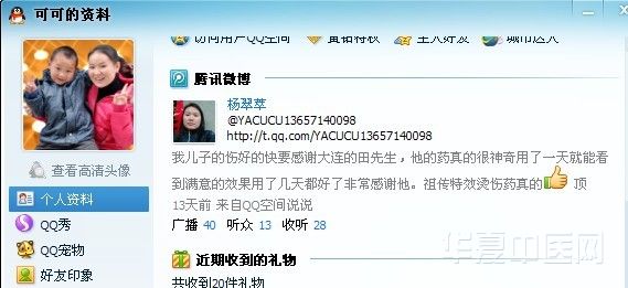 逍遥卡卡游 声名鹊起 正式会员 注册 2011/09/09 帖子 172 获得点赞 1 声望 0 2011/11/07 #34 这几天又治了几个小朋友烫伤,有的是在医院没有治好化脓的,在我的空间有像片,QQ8252338 可以加看我的空间像片