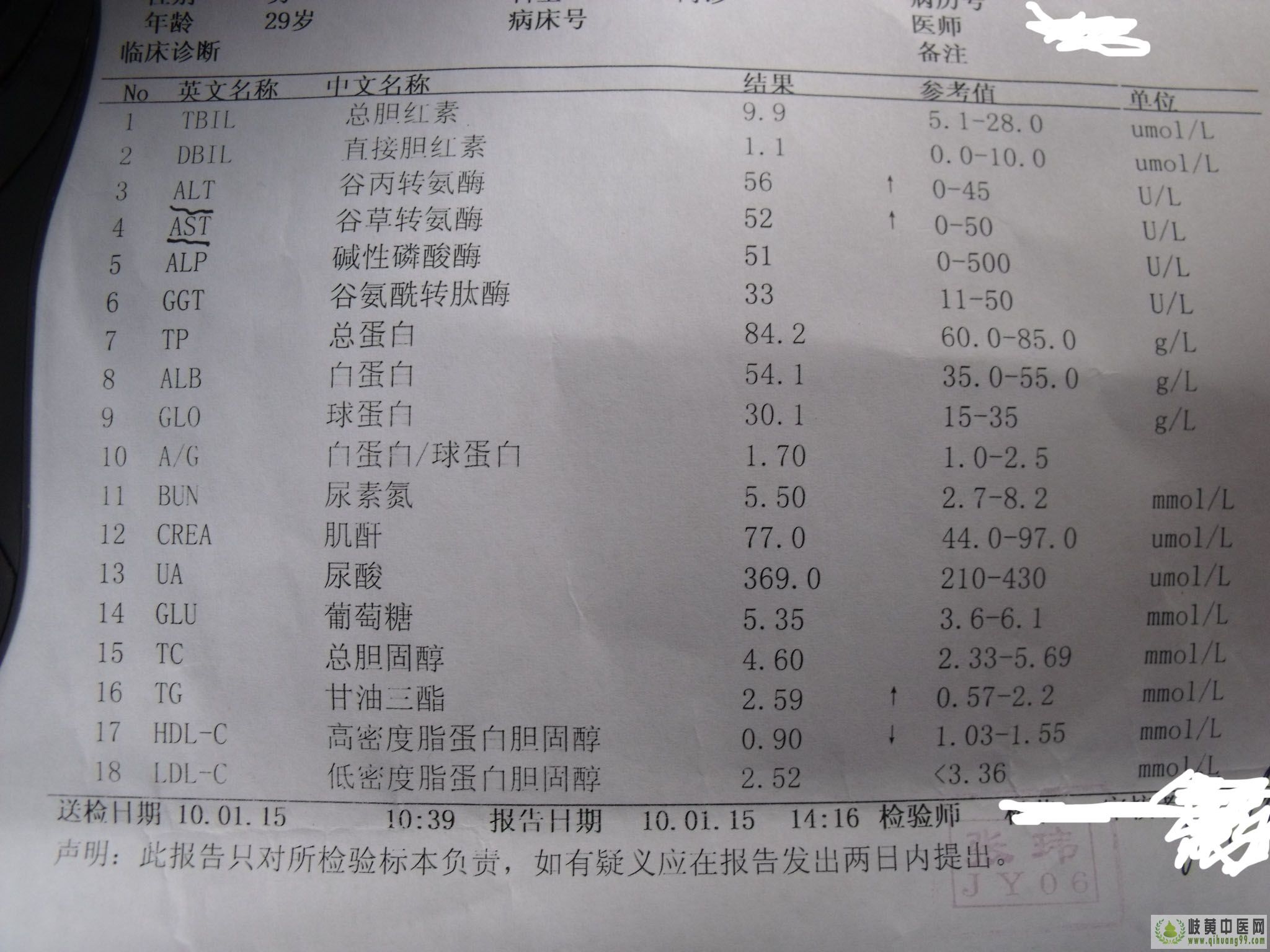 回复 4# 董兴辉 谢谢!您说是脂肪肝或者乙肝应该是对的。 就是两个月之前单位体检的时候,确诊为脂肪肝,要求到风湿门诊随防。之前也注射过乙肝疫苗,查两对半的时候,结果是全阴。 不好意思,再问一句!那用中医的湿阻开的药方恰当吗? 谢谢前辈!