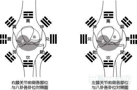 把膝关节看成是一个球体,是一个立体八卦,以髌骨盖为中心向四周延伸,看成是一副八卦图,以左膝关节为例,从髌骨盖的正上沿前开始,按顺时针方向依次分为坎、艮、震、巽、离、坤、兑、乾八个方位,即八个卦位,此八个卦同样具有相应的五行属性。看左膝时,从后向前看,以膝关节正上方为坎方,按顺时针方向定卦位。看右膝时,从前向后看,同样以膝关节正上方为坎方,按逆时针方向定卦位。