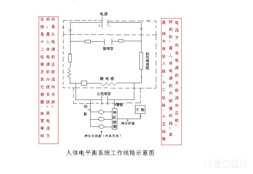 根据内脏器官、肌肉、骨胳、筋膜等组织结构的不同,这些器官组织在人体电平衡系统中充当不同的电器角色:它们有脏电容、腑电感、肌肉电阻、筋膜电阻、系膜导线等,人体电平衡系统在它们的共同作用下维持了人体电流、电压的平衡,保持了人体体温的稳定。人体电平衡系统的工作线路示意图见图1、人体电平衡系统循环示意图见图2、人体电平衡系统外线系统电路简化图见图3。