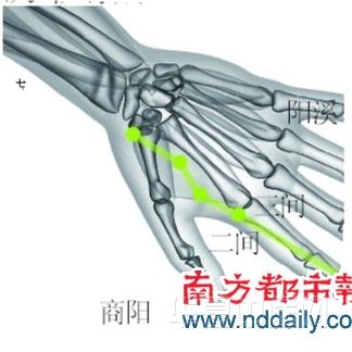 黄华君:大肠经属阳明经是气血都很旺的经络,可以调节人体阳气输布的状态。阳气不足时用补法可以帮助人体增强阳气,通过针灸的泻法、刺血、放血可把多余的火气去掉。《黄帝内经·灵枢·经脉》中有一段讲到了大肠经阳气不足时导致的疾病:“大肠手阳明之脉,是动则病齿痛,颈肿。是主津液所生病者,目黄,口干,鼽衄,喉痹,肩前臑痛,大指次指痛不用,气有余则当脉所过者热肿,虚则寒栗不复。为此诸病,盛则泻之,虚则补之,热则疾之,寒则留之,陷下则灸之,不盛不虚,以经取之。”这里讲的是,当手阳明大肠经受邪气干扰时,则容易发生牙齿疼痛、颈肿等问题。假如大肠经所主的津液发生了病变,就会出现眼睛发黄、口干舌燥、咽喉肿痛、食指不灵活等。日常生活中大肠经也是运用挺广的,针灸四总穴里有讲“面口合谷收”,就是用大肠经上的合谷穴来治疗牙痛,曲池穴通便。顺经刮食指治腹泻,合谷穴配曲池穴治肩痛,商阳穴刺血可退烧及治疗咽喉肿痛。
