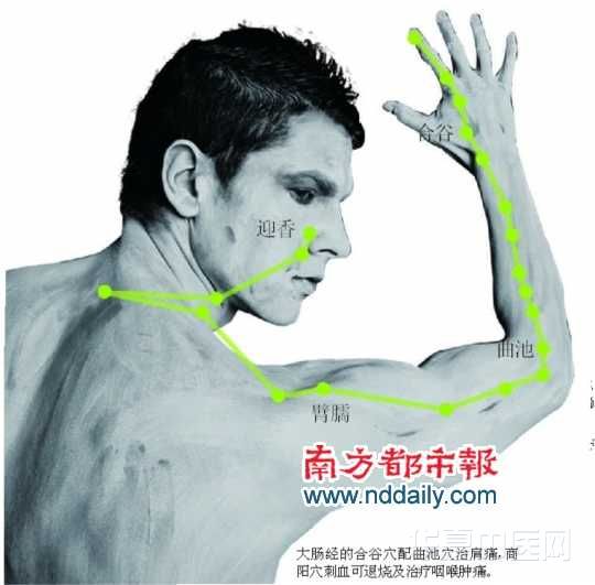 点按大肠经上的合谷穴可治牙痛,配合曲池穴可治肩痛
