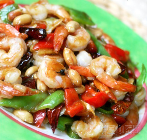 虾肉175克 熟花生米 植物油80克 红油 二、5克 盐2克 酱油 7毫升 醋5毫升 鸡精 0.5克 淀粉10克 胡椒粉 0.5克 干红辣椒5克 糖 8克 料酒10毫升 蛋清 5克 葱10克 姜片 8克 蒜片6克 彩椒