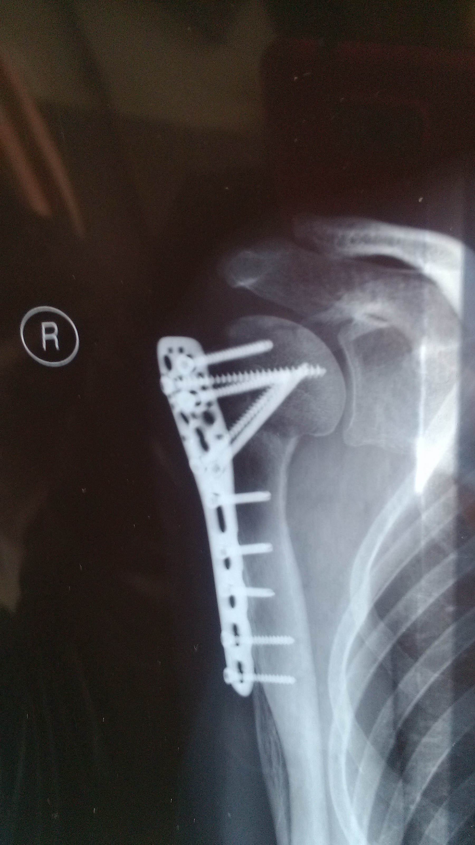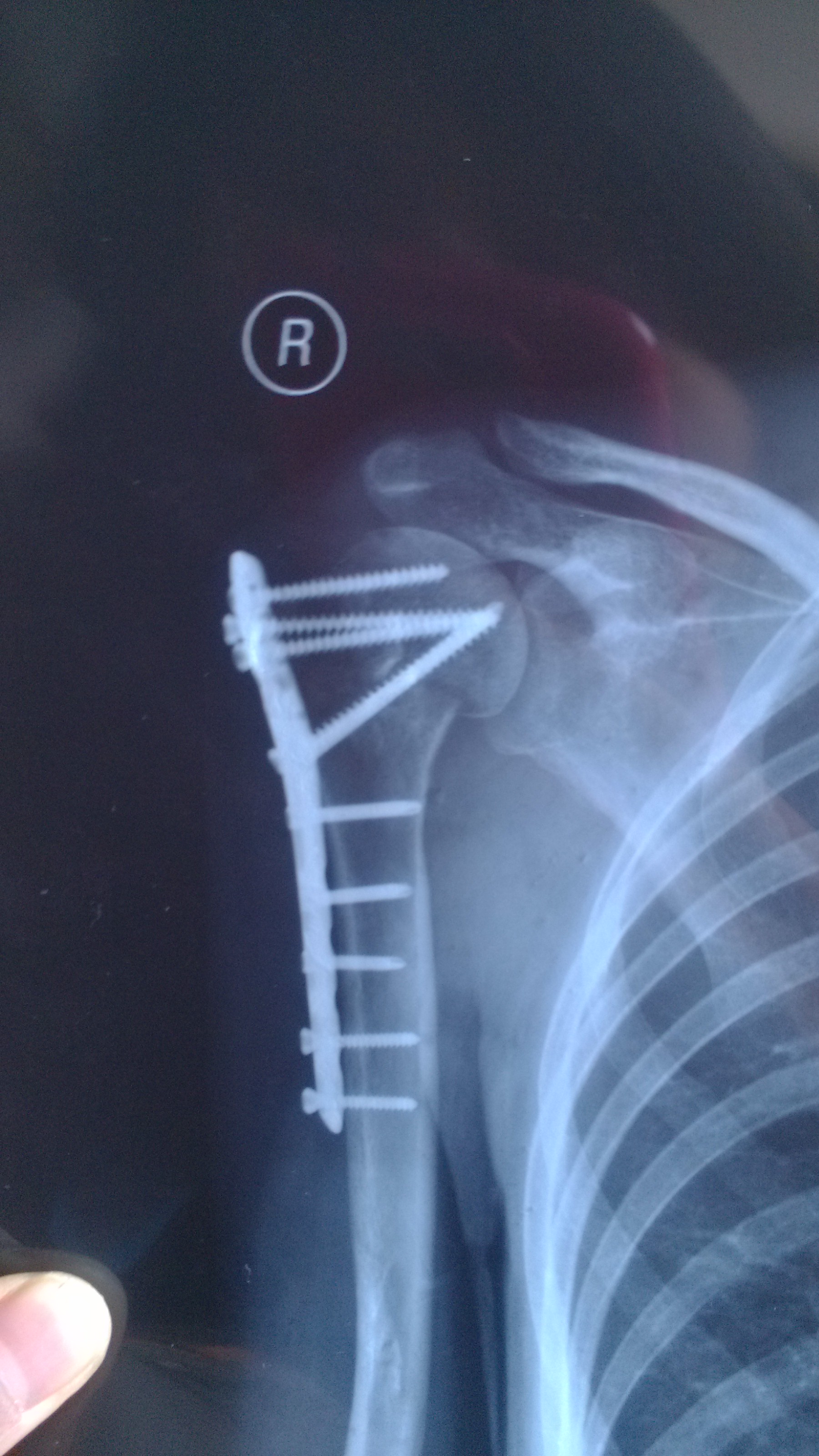 本人是代人求医,大概情况如下:外侄媳妇何姓,25岁余,于去年十月因车祸后到医院就医,庸医误人,初期诊断为左肱骨脱位而施行中医复位手术,因当时肱骨头被卡在肋骨缝里,由于误诊误治而生拖硬拽造成肱骨头被活生生拉掉。后施外科接骨手术,缝钢钉,并一直治疗。现在病人疼痛不甚,于术后三月后照片示肱骨头与肱骨体接缝处无明显的骨痂形成,但也没看出肱骨头痿缩的征象。这段时间主要是进行输液及口服药治疗,后期适当配合了一些简单的手法帮助患者放松肌肉等。未服中药。