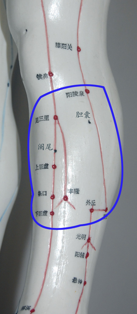 一7岁小男孩,长了一胸膛的痱子,用拍打小腿刺激经络穴位,一胸膛的痱子一夜消光。拍打部位如图所示,蓝色线圈住的部位,每条腿拍打8分钟左右。