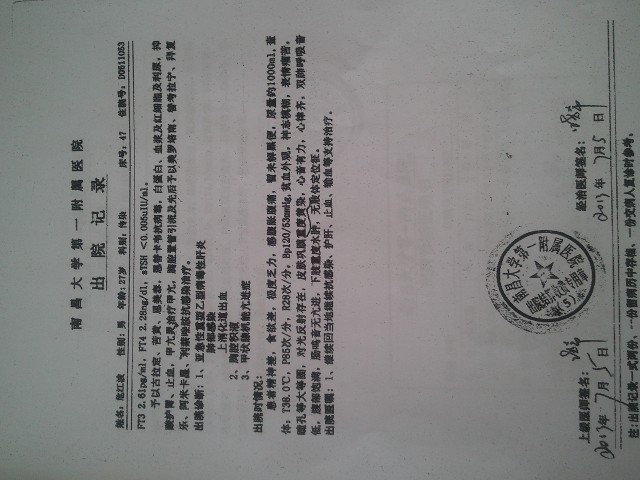 这是东北林业大学交通学院一个刚毕业有一年的研究生,本应该是怀揣着青春的梦想去打拼的时候,却不得不遭受着病痛的折磨,已在南昌大学第一附属医院就诊36天,病情仍然没有得到缓解,诊断结果显示是亚急性重型乙型病毒肝炎,肺部感染,上消化道出血,胸腔积液,甲状腺机能亢进症。