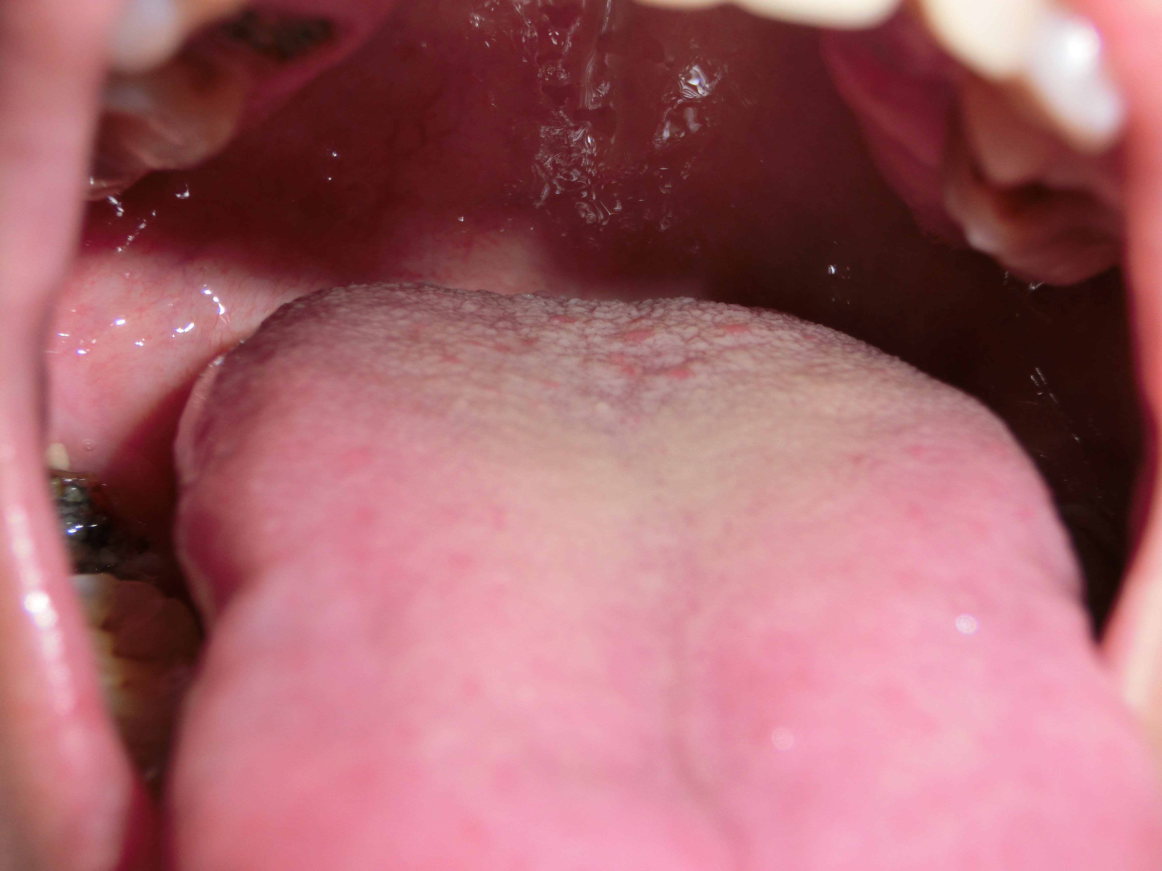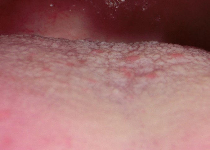 舌头上面靠近根部的地方起了好几个小红疙瘩,不疼,没有感觉,附照片,请各位专家给看看是怎么回事?
