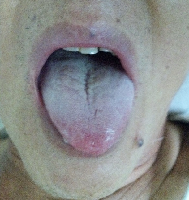 这个你看,舌头中间呢稍微有点凹陷。整体的感觉就是这个舌头偏硬,不够柔和,看着愣愣的,那么就是沉寒瘀结。这就是病的时间比较久了,瘀结更重一些。