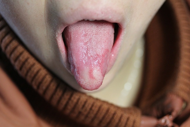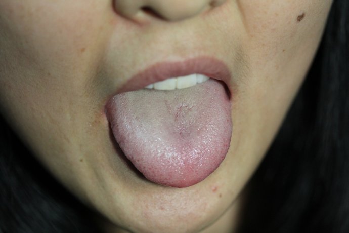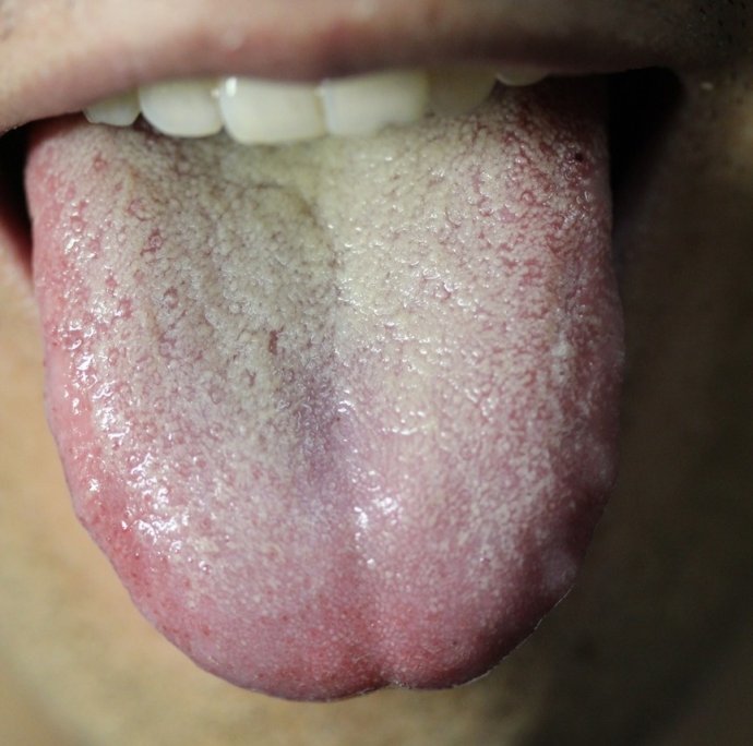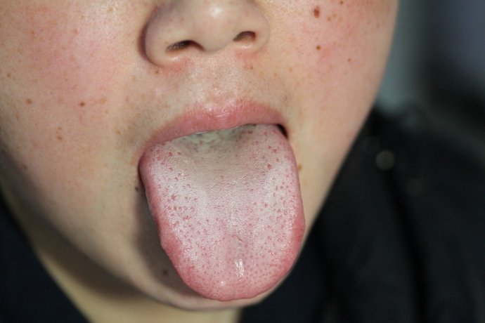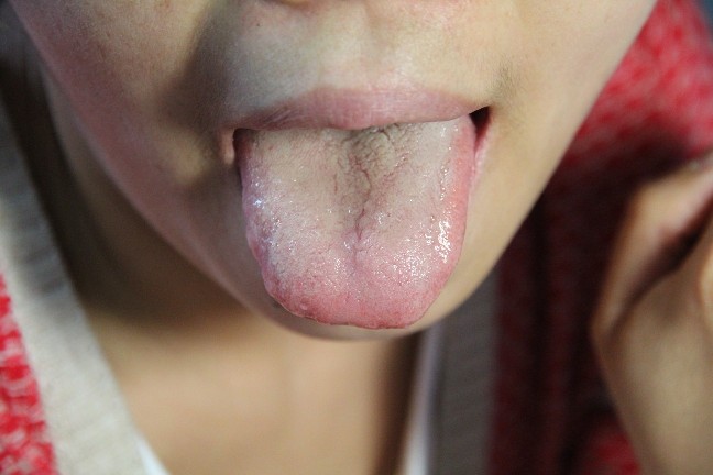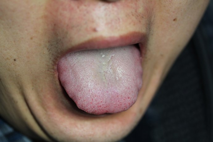 不同的舌头舌苔粘腻的程度不一样,这个舌苔就比较细腻,好像盖得比较严。你只要看到这个苔好快把舌头盖住了,不透气了,这种苔基本上都要用到皂角,不用皂角很难化开。