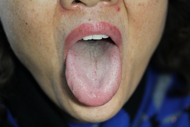 这个跟上一个类似,也是中间凹陷,前面有一些小点,他这个气比较足,亮度稍好一些,小点子长得比较大,舌头上没有那么多水液了,舌根看到比较清楚。
