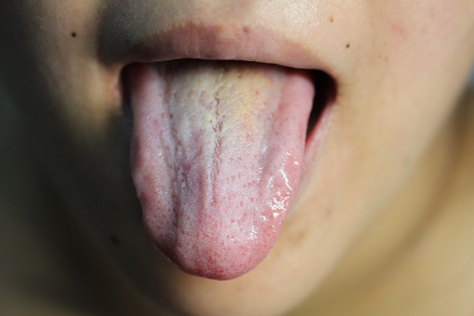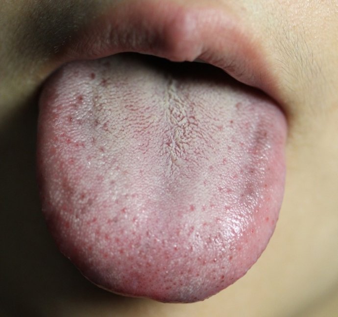 可以看到舌根部的舌苔是很腻的,也就是说气从肾气的地方就开始郁上了,出来的就是一股郁结之气,走到哪儿郁到哪儿。如果只是郁在中焦,肾气还比较通透的话,底下是不会有小疹子的,一般都是郁在舌尖或者舌头偏前偏上的两侧部分。