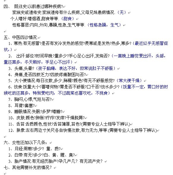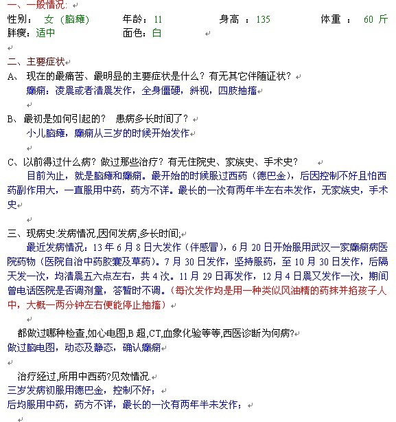 一、一般情况: 性别: 女 (脑瘫) 年龄:11 身高 :135 体重 : 60斤 胖瘦:适中 面色:白 二、主要症状A、 现在的最痛苦、最明显的主要症状是什么?有无其它伴随证状?癫痫:凌晨或者清晨发作,全身僵硬,斜视,四肢抽搐 B、 最初是如何引起的? 患病多长时间了?小儿脑瘫,癫痫从三岁的时候开始发作 C、 以前得过什么病?做过那些治疗?有无住院史、家族史、手术史? 目前为止,就是脑瘫和癫痫。最开始的时候服过西药(德巴金),后因控制不好且怕西药副作用大,一直服用中药,药方不详。最长的一次有两年半左右未发作,无家族史,手术史 三、现病史:发病情况,因何发病,多长时间;最近发病情况:13年6月8日大发作(伴感冒),6月20日开始服用武汉一家癫痫病医院药物(医院自治中药胶囊及草药)。7月30日发作,坚持服药,至10月30日发作,后隔天发一次,均清晨五六点左右,共4次。11月29日再发作,12月4日晨又发作一次,期间曾电话医院是否调剂量,答暂时不调。(每次发作均是用一种类似风油精的药抹并掐孩子人中,大概一两分钟左右便能停止抽搐) 都做过哪种检查,如心电图,B超,CT,血象化验等等,西医诊断为何病?做过脑电图,动态及静态,确认癫痫 治疗经过,所用中西药?见效情况.三岁发病初服用德巴金,控制不好;后均服用中药,药方不详,最长的一次有两年半未发作; 四、 既往史:以前患过哪种疾病?家族史或遗传史:家族遗传有什么疾病,父母兄妹患病情况.(无) 个人嗜好:嗜烟酒,甜食等等.(甜食)性格喜恶:内向,外向,暴躁,性急,生气等等.(性格急躁,生气) 五、中医四诊情况: 1、寒热:有无感冒?是否有发冷发热的感觉?畏寒或是发热?热多,寒多?(最近似乎无感冒症状,) 2、 出汗:部位?时间早晚?量多少?手心足心出汗,发烧否?(一直晚上睡觉爱出汗,头部,量还算多,冬天稍好,手足心不出汗) 3、头痛,头晕?(孩子脑瘫,表达不好,但常说肚子不舒服) 4、身痛,是否四肢乏力?四肢疼痛酸困与否? 5、大小便情况:每日次数,多少,稀稠?颜色?有无不舒服感觉?(常大便干燥) 6、饮食:饭量大小?喜嗜何物?胃是否不舒服?口干否?饮水多少?(饭量不一定,胃口好的时候吃的还算多,特别爱吃肉,不过蔬菜也喜欢吃,不挑食) 7、胸闷,心悸,气短与否? 8、耳聋?鼻塞? 9、睡眠情况:失眠?多梦?嗜睡? 10、皮肤:颜色?肿胀?疔疖?发痒?干燥脱屑? 11、舌苔:舌质颜色,性状?舌苔簿厚,苔色?(需要专业人士指导下辨认) 12、脉象:左右两边寸关尺各自快慢次数,有力无力,等等.(需要专业人士指导下辨认) 六、女性还加以下几条: 1、月经:周期?多少? 量、质? 2、白带:有无?多少?白、黄、腥、臭? 3、胎产情况:有无经历胎产?孕几产几?有无流产史?七、其他需要补充的情况?