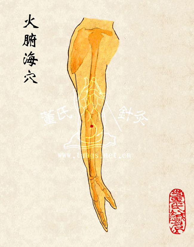 辨别:董公所著取穴法为火山穴后两寸,亦与手三里穴混淆,与胡著所取两者有所不同,本穴以胡师之取法较合董师所传之穴位。