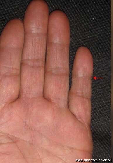 【取穴】位于小指末端关节横纹尺侧尽端处。红箭头所指部位。