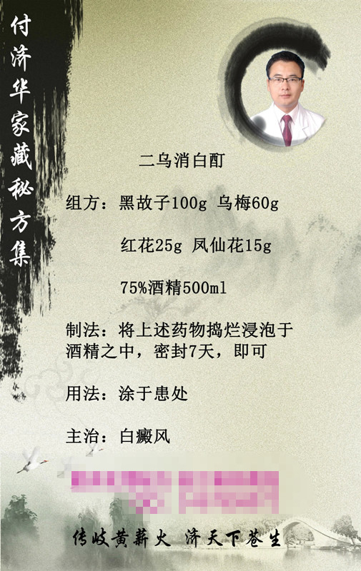 [font=微软雅黑, Tohoma]方解 :白癜风是由于局部皮肤黑色素脱失所致,皮损为色素脱失斑,通常为局限的乳白色斑块。中医学认为是肾虚所致,因为肾在五行对应的五色中,所对应的是黑色,中医又有黑色入于肾之说,所以肾虚之后,黑色不能为其所主而脱失,形成白斑。方中黑故子(补骨脂)色黑入肾,有补肾助阳之效,同时此药制成酊剂外用有“发赤作用”,能够刺激皮肤,使皮肤发红、发赤、色素加深,故用其为君药。乌梅色黑,味酸有收敛之性,能够让白斑周围的黑色皮肤向病变中心收缩、靠拢、而为臣药。红花活血化瘀可以改善局部微循环,而为佐药。凤仙花是透骨草的花,我们老家称其为“指甲草”,小时候女孩子们拿它抱住指甲,过一夜指甲就变成了红色(凤仙花是红色的),根据此特性我们用少量的凤仙花加入大剂量的黑色药水之中,可以使其将药物的黑色素导入到皮肤之中,直达病灶,而为使药。本方是付济华医师家传秘方,专门治疗白癜风的外用特效方。方小力专,疗效不凡,切莫因其方小而轻视之。[font=微软雅黑, Tohoma]病案举例