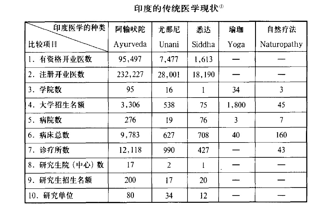印度医学以五支为主要代表,阿育吠陀(生命之学)、尤那尼(自愈)、悉达(神灵医学)、瑜伽、自然疗法。其中具有中医至今不曾明确甚至缺少系统专著的传统医学部分:如胚胎发育过程、传统外科手术、专论军医部分、神灵医学、鬼神学等。下表是印度医学五支医学构成比例(此表源自近30年前1988年日本编著的《印度医学概论》,但比例具有参考价值,数据已过时。百度是没有更新的中文数据)。