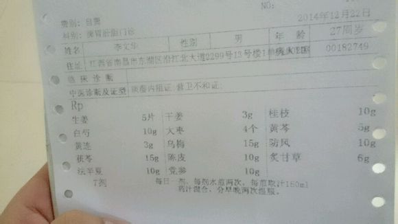 去年12月份找省中医院的脾胃肝胆的医生看过一个月,没有什么起色,而且吃了他给我开的最后一次药,我现在莫名其妙多了一个右鼻孔擤鼻涕就会出血丝,药方如下