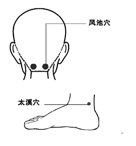 经常按摩风池穴和太溪穴,可改善精血亏虚、气滞血淤的症状,而达到滋阴乌发。 中医认为,脱发、白发是由于肝肾不足所引起。现代人的饮食与生活习惯正是导致 后天肝肾功能失调的原因之一。从中医的经验,当脏器功能不佳时,刺激其相关的经络,可以强化经络的机能。经常按摩风池穴和太溪穴,可改善精血亏虚、气滞血淤的症状,而达到滋阴乌发。
