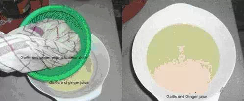 1、蒜头去皮,姜去皮切小片,放入榨汁机榨汁,或者放入搅拌器打成浆,用网布隔渣,绞出汁。