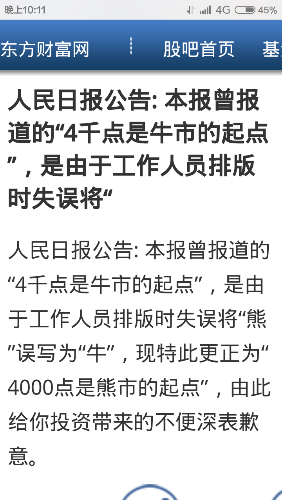 在股市调整合做空声音大起的时候,人民日报又一次出来摇旗呐喊,这次干脆直接就给股市定底了,说4000点,是牛市之始。 股市存在不确定性,虽然有人民日报鼓舞人气,虽然说是代表国家意志,但是最终的结局还是要看股市,这则消息,供大家参考。