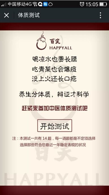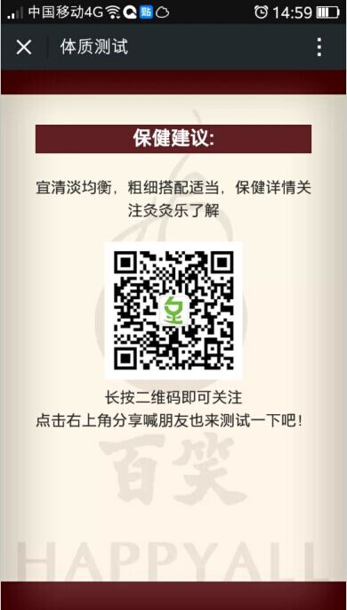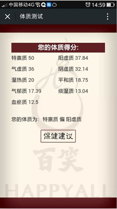 七月份的尾巴 惊鸿一瞥 正式会员 注册 2015/04/17 帖子 12 获得点赞 0 声望 0 2015/04/24 #1 今天朋友圈被体质测试刷屏了,我知道我身体不好也进去测试了下,主要是想看保养建议,平时也好注意调养,晒晒我的测试结果和保养建议,各路中医专家也给点建议呗! 附件 11.jpg 34.5 KB 查看: 24 12.jpg 63.2 KB 查看: 20 13.jpg 34.6 KB 查看: 19 14.jpg 33.2 KB 查看: 28 15.jpg 36 KB 查看: 23