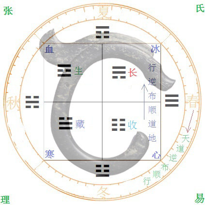 天地对应,即同道:乾春离生,为春生通道。艮夏巽长,为夏长同道。坤收坎秋,为秋收同道。震冬兑藏,为冬藏同道。