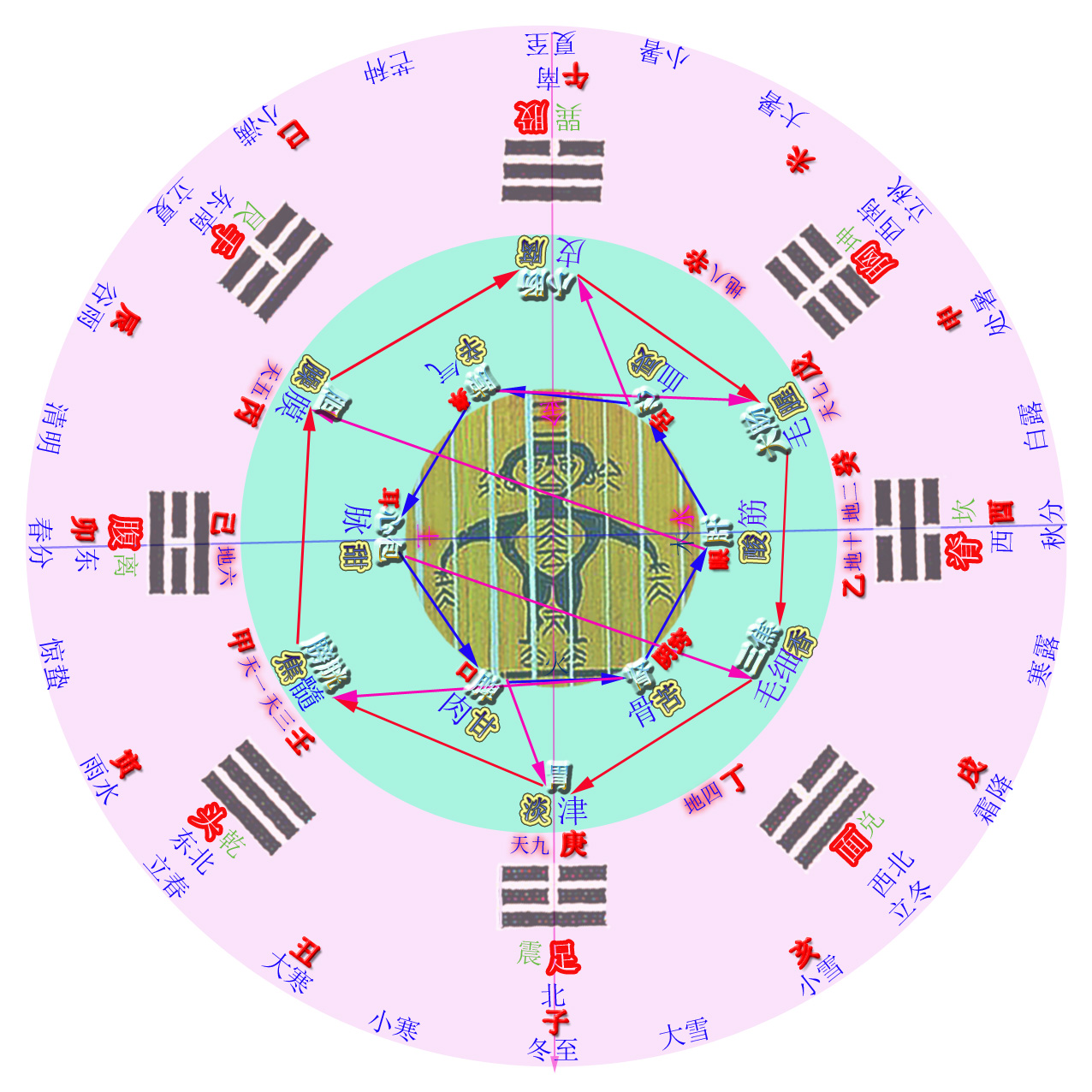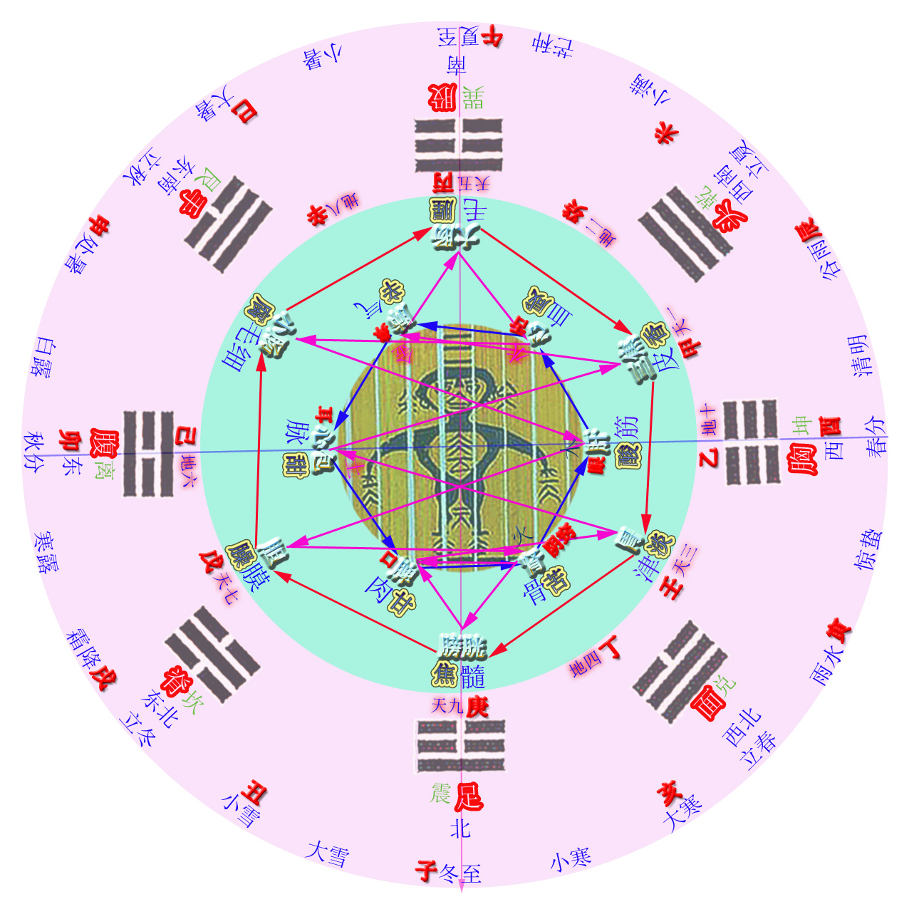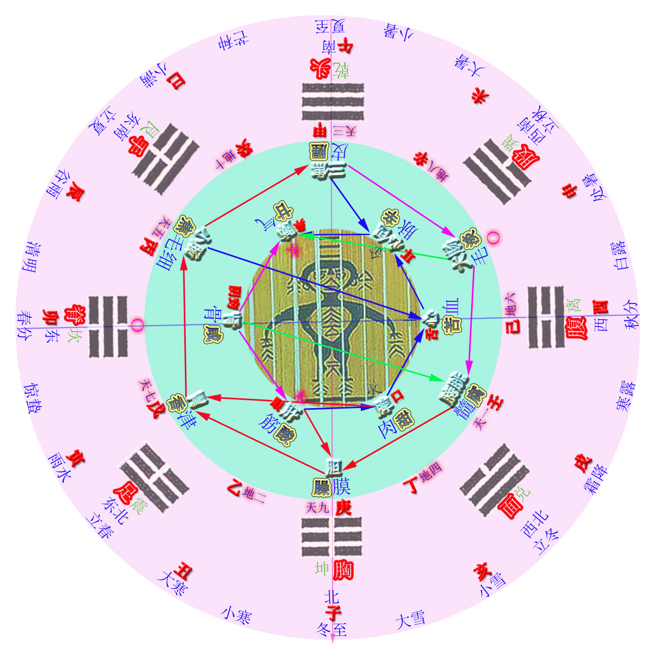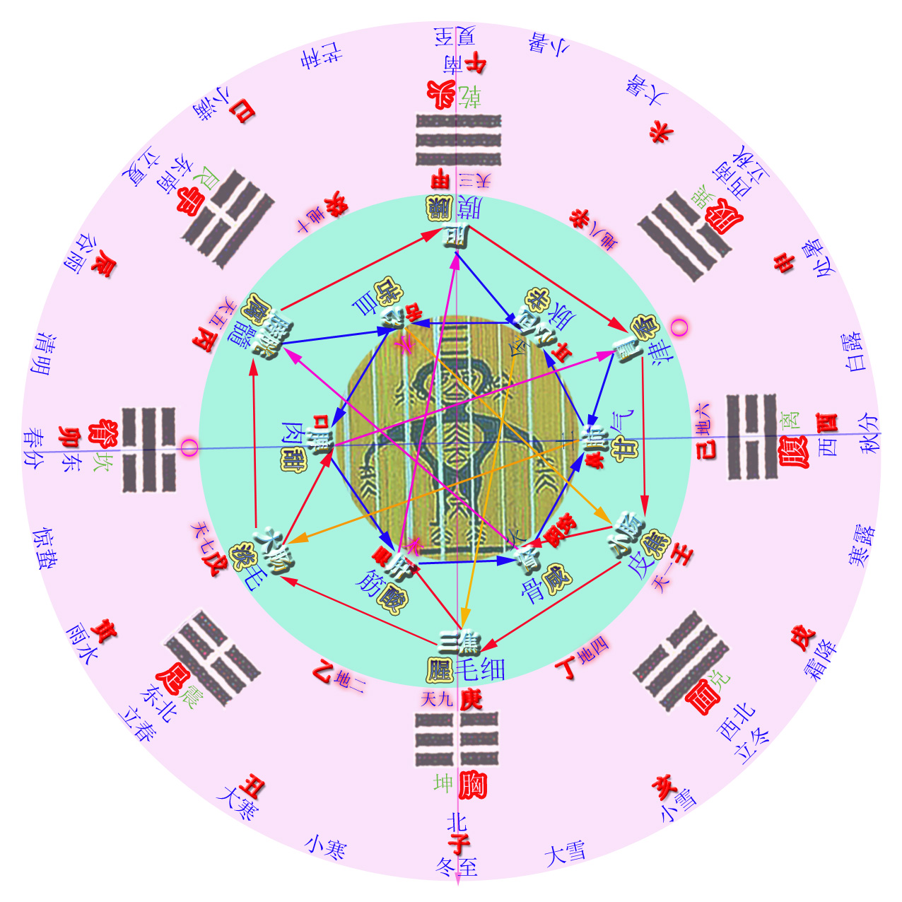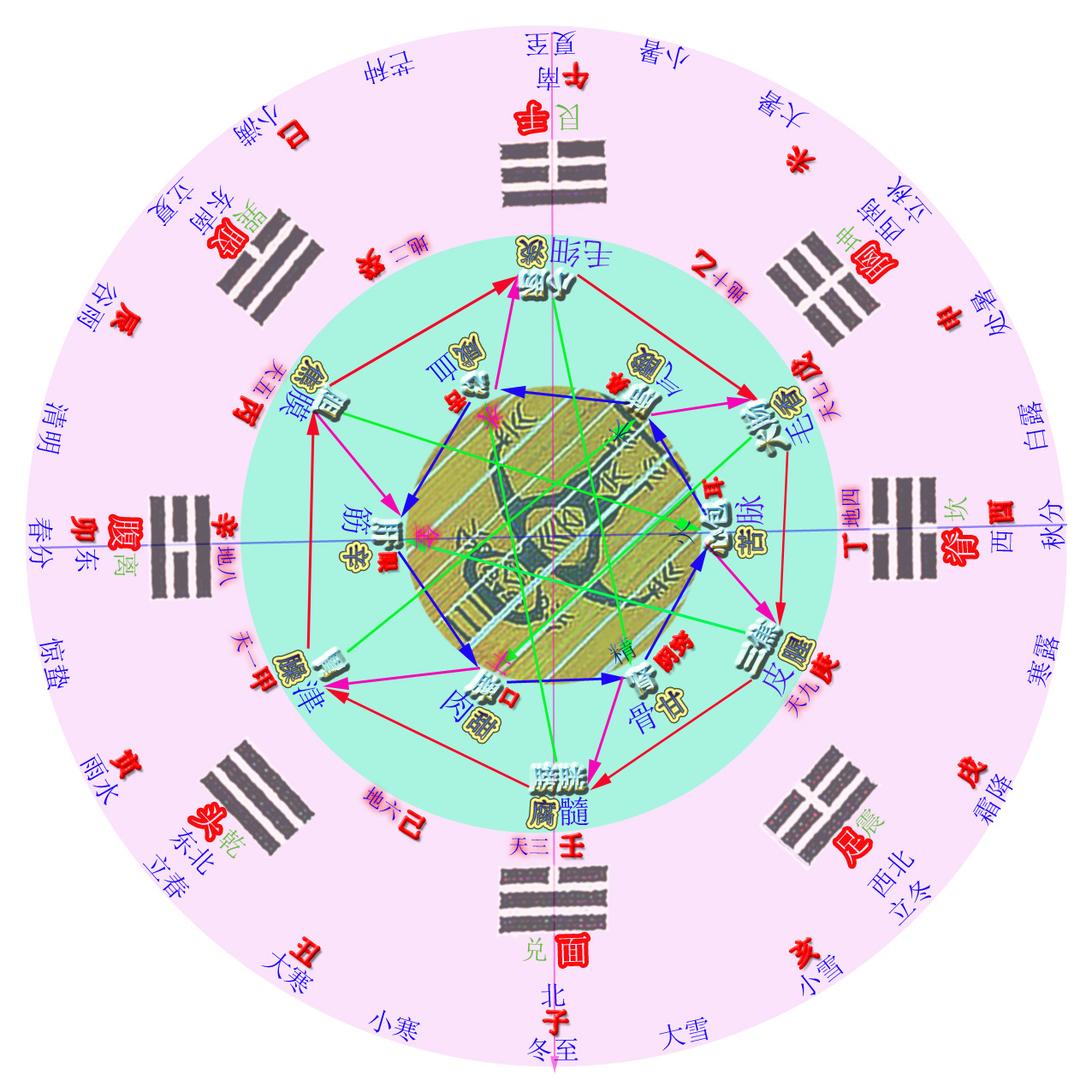 是以:地道酉、亥、丑三时,地之虚变实,释放寒量。酉里、亥中、离外。地道卯、巳、未三时,地之实变虚,释放热量。卯里、巳中、未外。