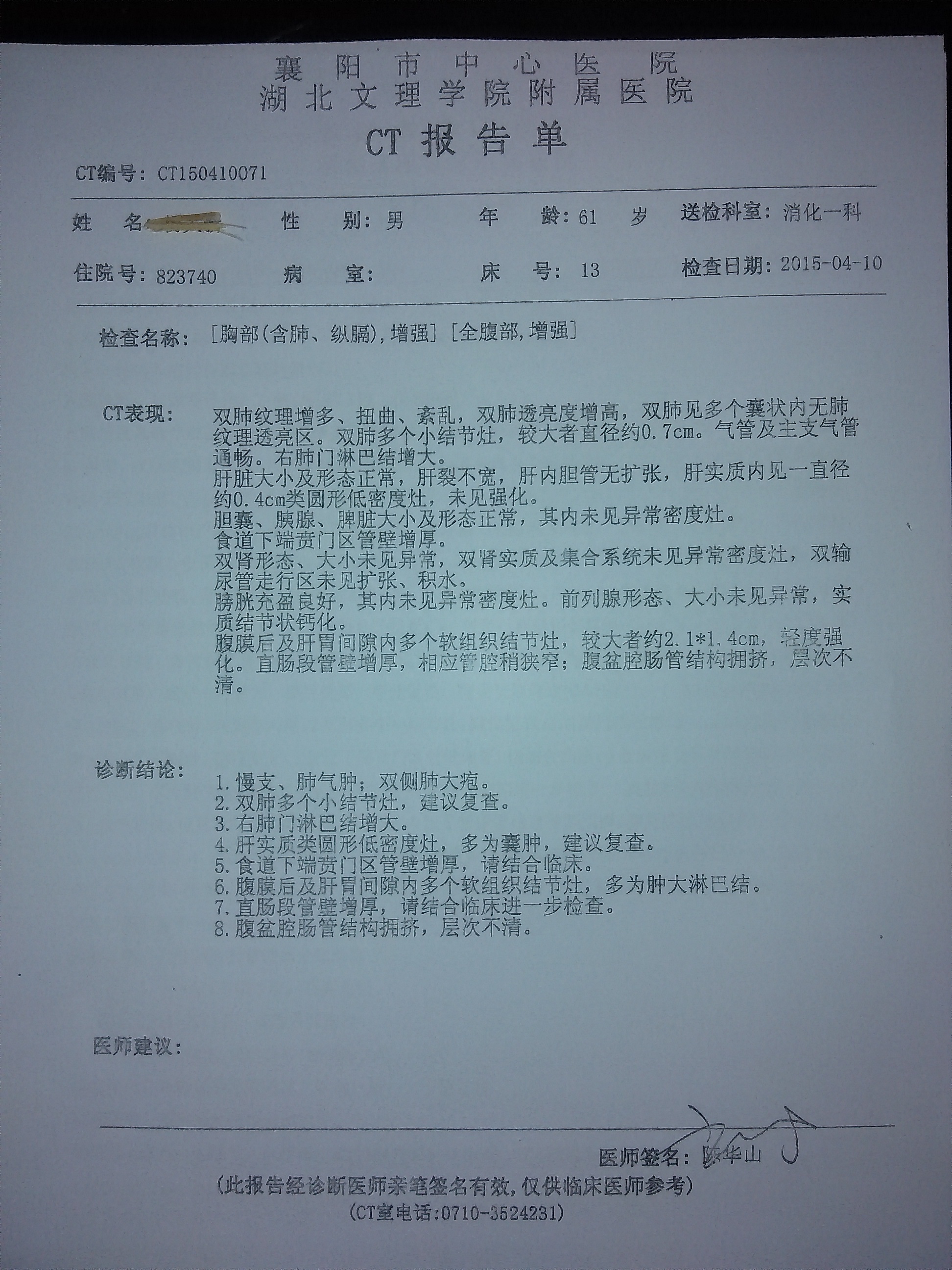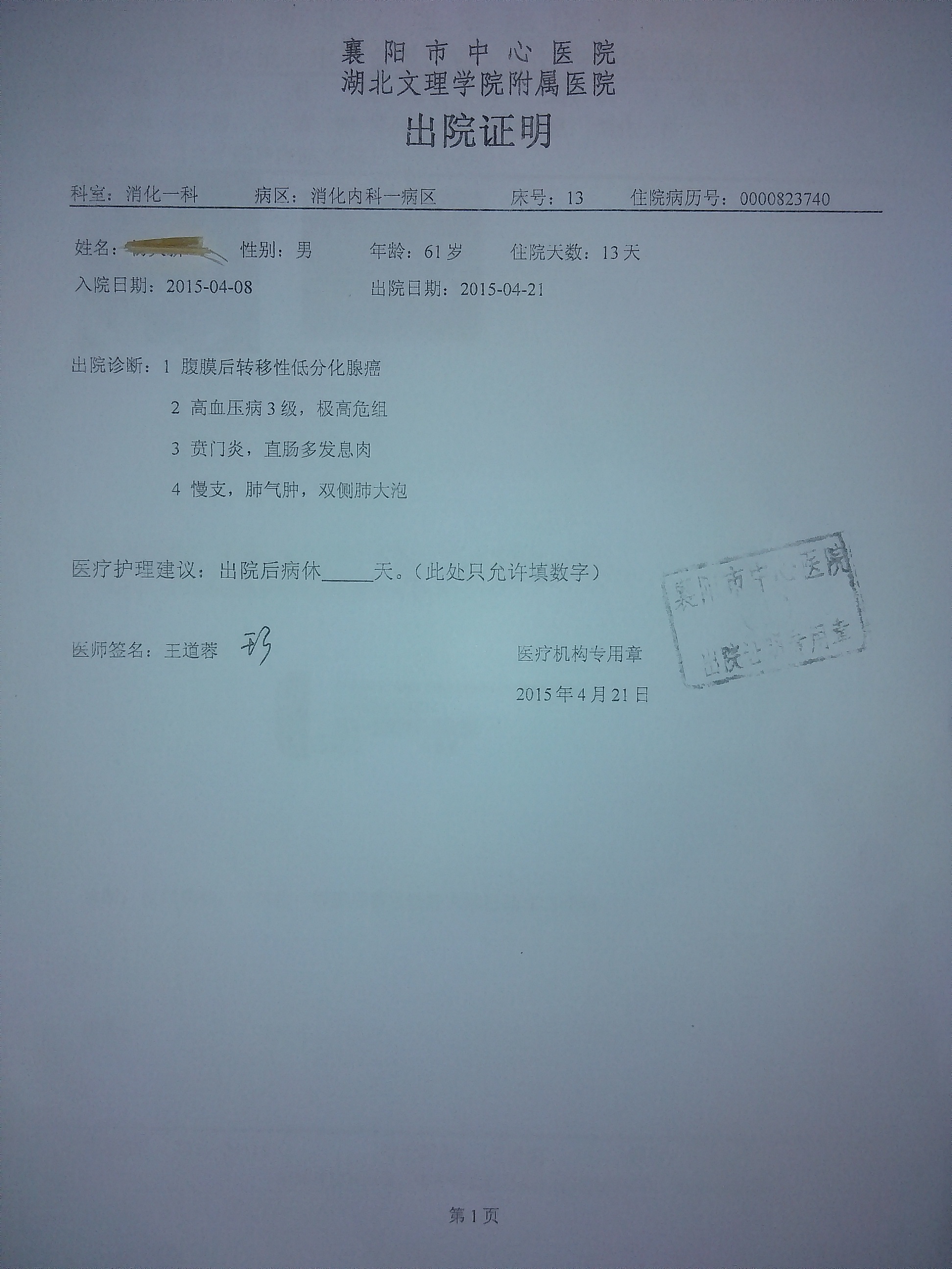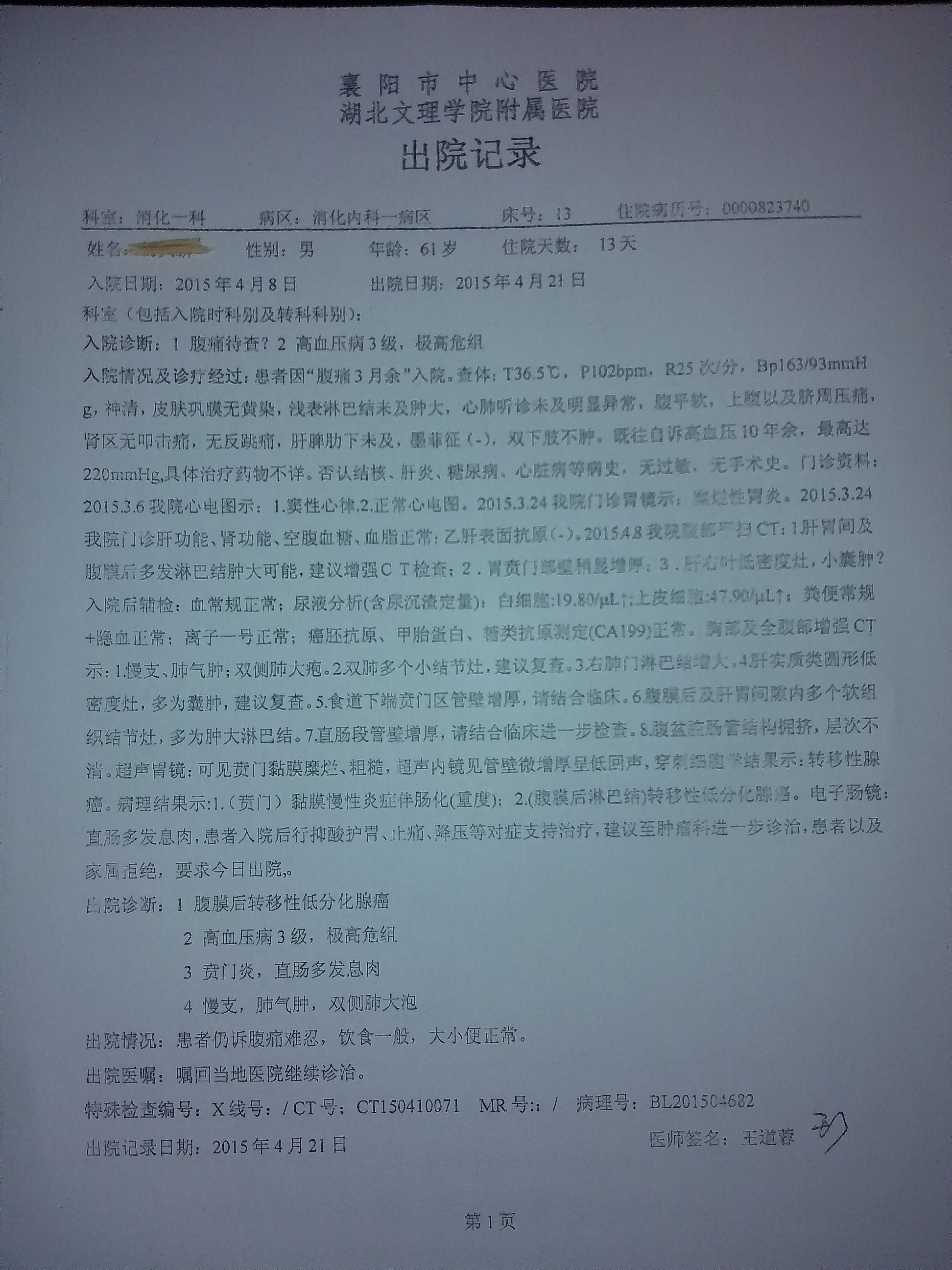 出院诊断:1,腹膜后转移性低分化腺癌;2,高血压病三级,极高危组;3,贲门炎,直肠多发息肉;4,慢支,肺气肿,双侧肺大泡。