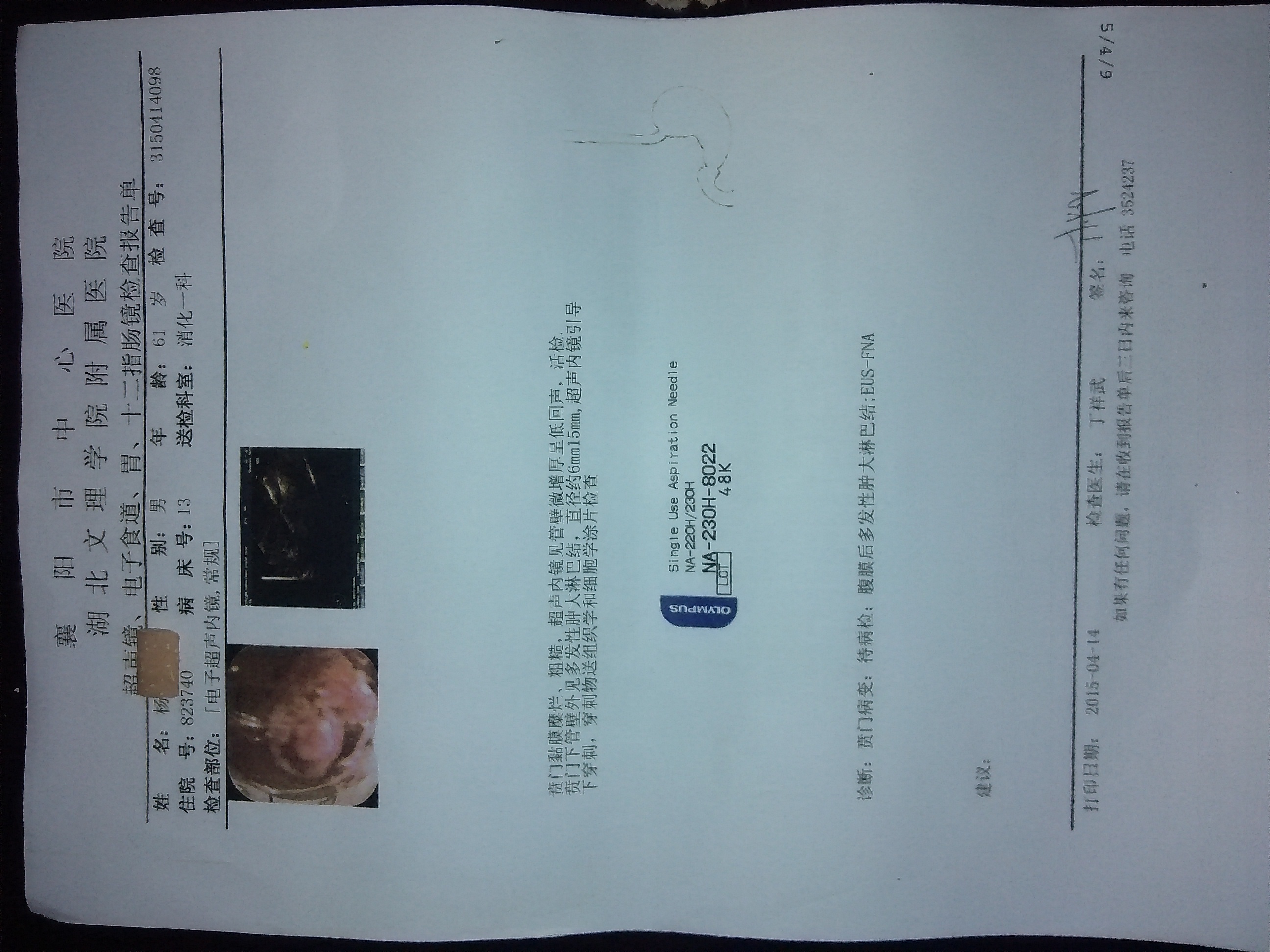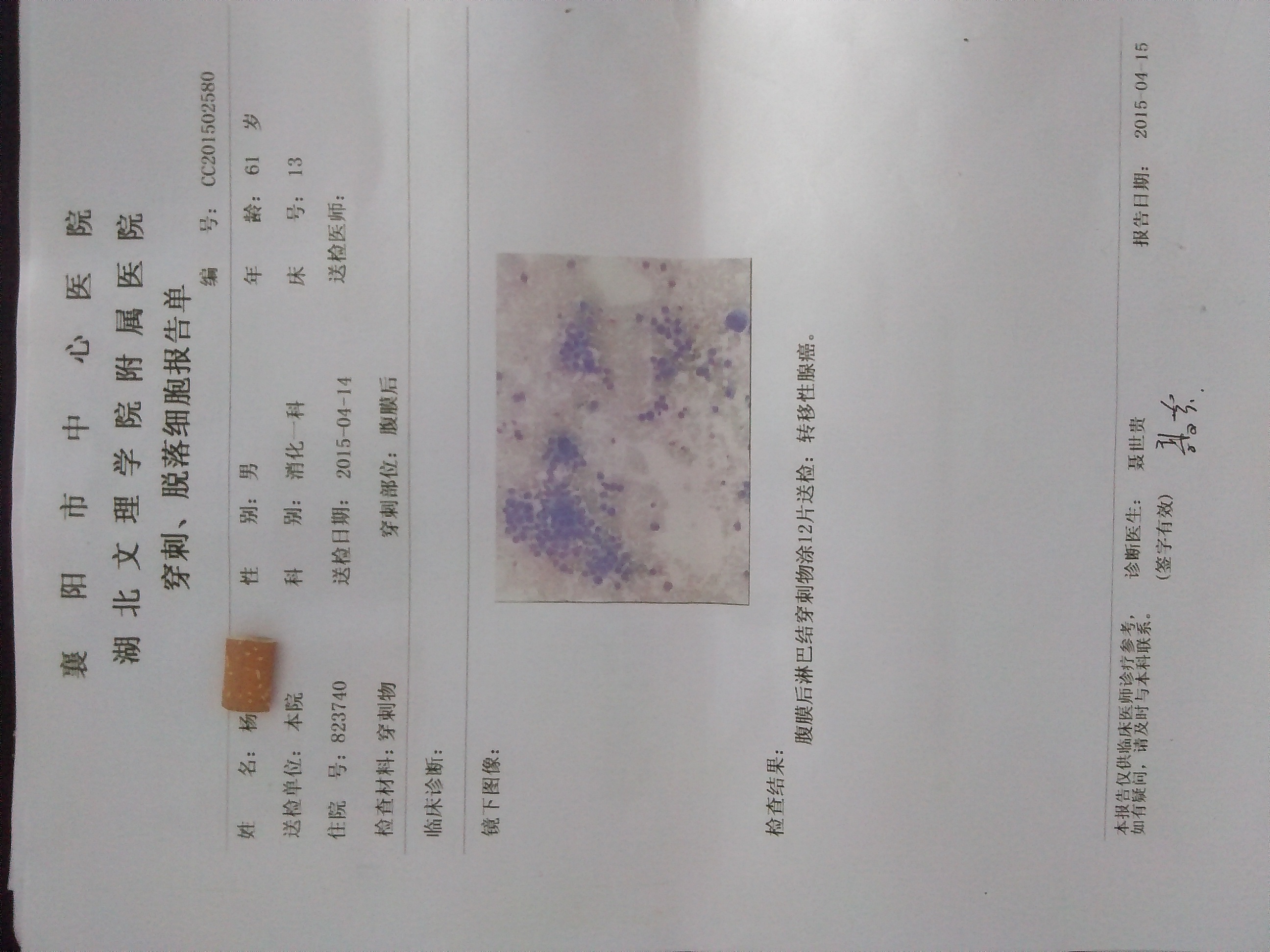 患者杨某,61岁,2015年4月26日经病友介绍来诊。述腹痛数月,于4月8日入院治疗,4月21日出院,共住院13天,除了得出一个癌症的结果外,无任何疗