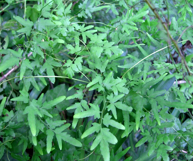 植物形态:多年生攀援草本。根茎细而匍匐,被细柔毛。茎细弱,呈干草色,有白色微毛。叶为1-2回羽状复叶,纸质;能育羽片卵形三角形,小叶卵状披针形,边缘有锯齿或不规则分裂。孢子囊生于能育羽片背面,多在夏秋季产生。