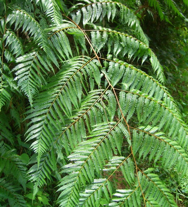 植物形态:大型蕨类,主干高达2-6米,深褐色或浅黑色,外皮坚硬,有老叶脱落后留下的痕迹。叶丛生于主干顶端;叶柄和叶轴粗壮,深棕色,有密刺;叶片巨大纸质,长1-3米,3回羽状分裂,羽片长距圆形,先端长渐尖,羽轴下面无毛,但下部有疏刺,上面连同小羽轴疏生棕色卷曲有节的毛,小羽轴和主脉下面有略呈泡状的鳞片;小羽片羽裂几达小羽轴,裂片披针形,短尖头,有疏锯齿。叶脉分叉。孢子囊群生于小脉分叉点上凸起的囊托上,囊群盖近圆球形,膜质,初时向上包被囊群,成熟时裂开。