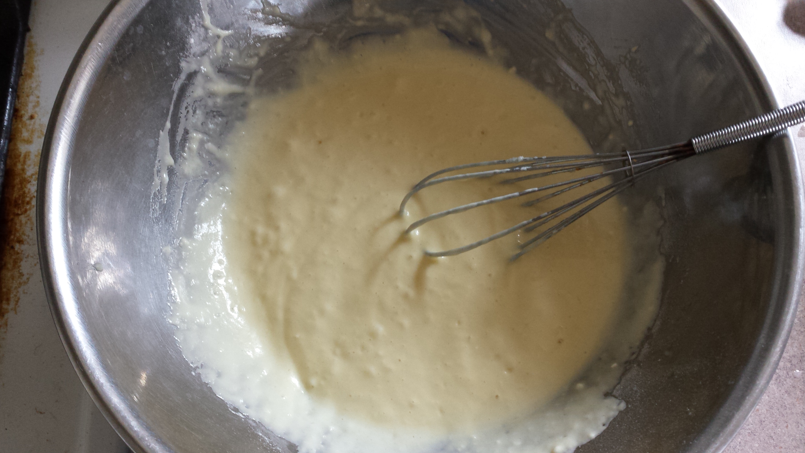 5. 将配料组1和2的液体食材混合均匀,加入到放置干料的大盆中搅匀,直到没有任何面疙瘩为止。