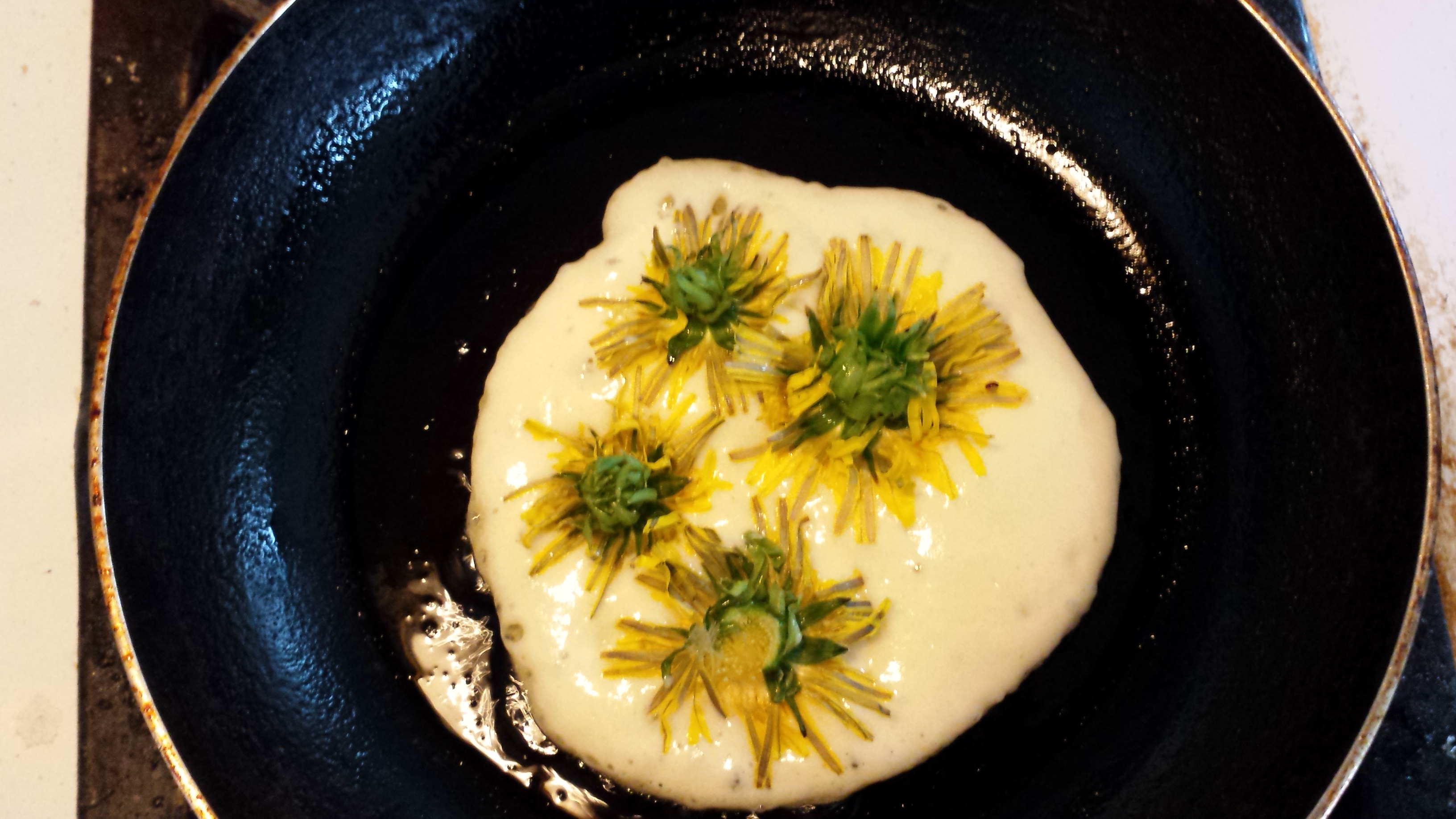 6. 小煎锅放火上加热(中等火力即可),加一勺蔬菜油,让油在煎锅底面铺匀,舀一勺第5步制作好的面糊,放进煎锅中,稍旋转煎锅,是面糊呈圆形,趁面糊还没有干的时候,挑4朵新鲜蒲公英花,花瓣朝下压入面饼中。若是花瓣翘起很多,可以用工具将花瓣压入面糊里,不必太用力。