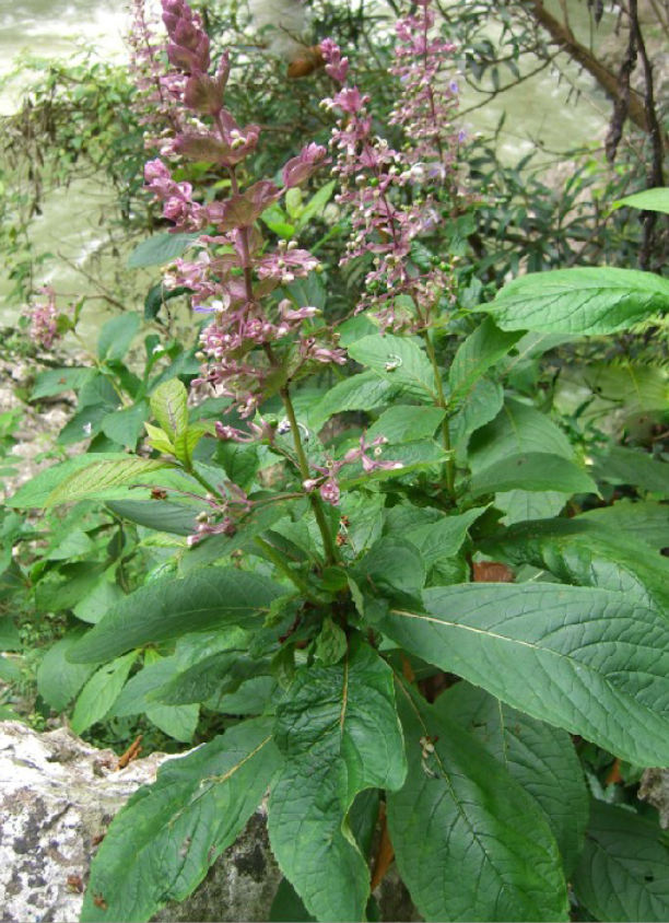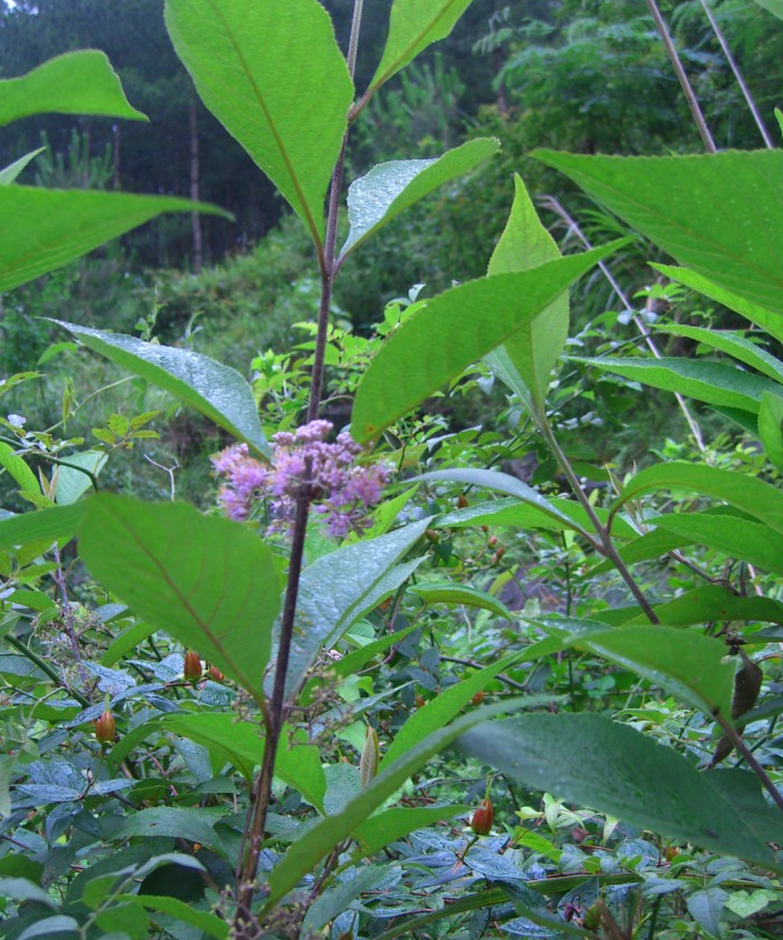 植物形态:常绿灌木或亚灌木,高1.5-2.5.米。根灰褐色。茎表面有皮孔,节膨大。3叶轮生,叶片倒披针形或倒卵椭圆形,基部抱茎,长15-25厘米,宽6-10厘米,先端长尖或急尖,基部渐狭,下延,边缘有锯齿,上面散生短柔毛,下面脉上密被短柔毛。圆锥花序顶生,花序梗密被紫色绒毛;苞片大,紫红色;萼钟状,先端截形,结果时宿存;花冠简通常细长,圆筒状,边缘开展,具有近整齐或不整齐的5裂片;雄蕊4,着生在花冠筒上,伸出花冠筒外;花柱伸出,顶端2裂。果实为浆果状核果。