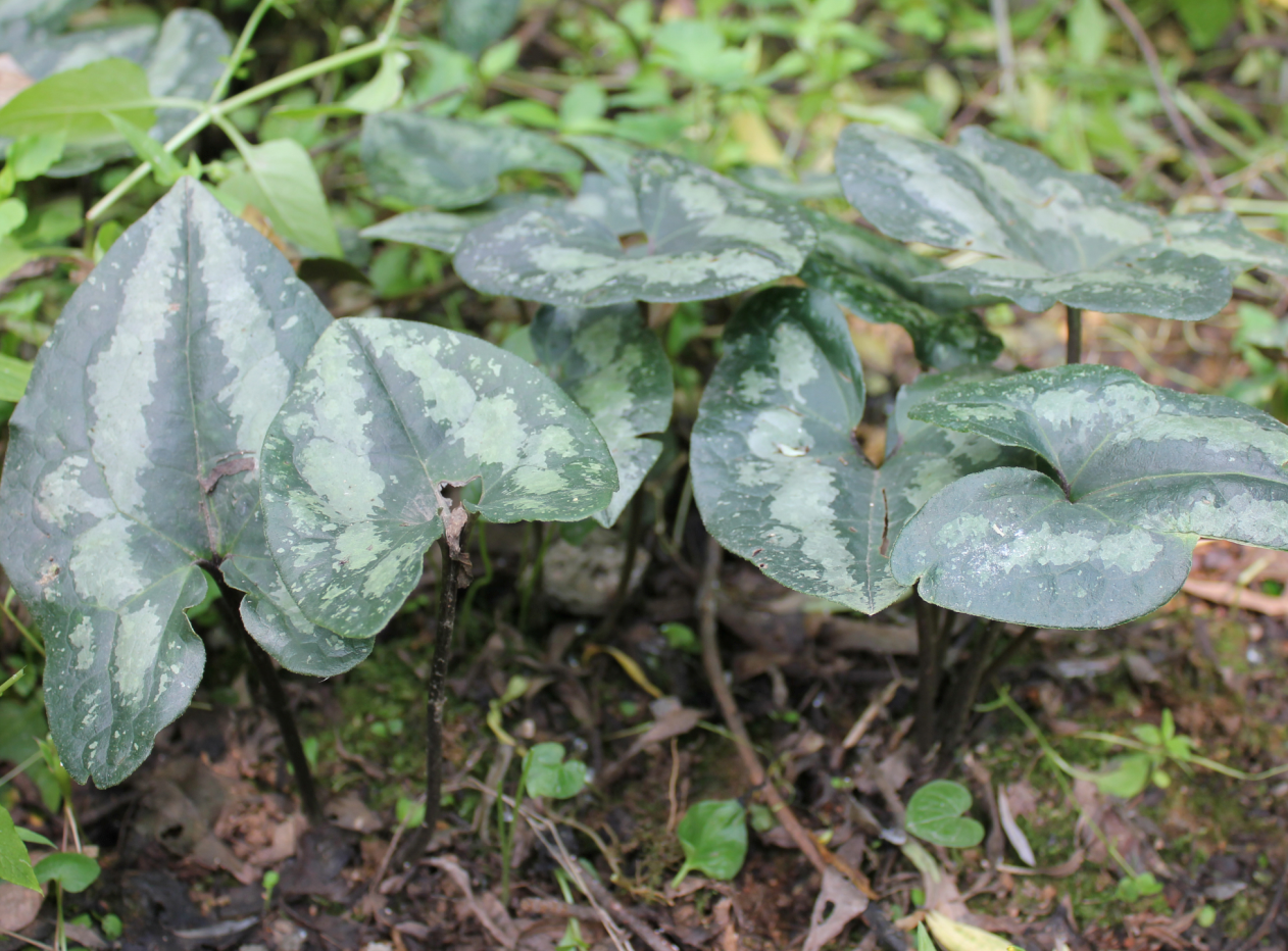 植物形态:多年生草本,有特殊的辛香气。根茎葡蔔而长,有节,须根多。叶簇生,2-3片或更多, 三角状心形,肉质,有白色或淡绿色斑块,先端渐尖,基部深凹如耳状。花单生,花柄极短,贴近地面,淡酱红色;萼钟状,3裂,辐射对称,宿存。蒴果。