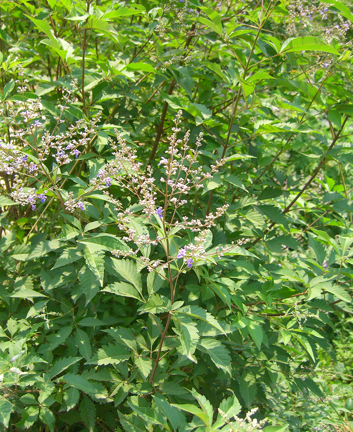 植物形态:落叶灌木或小乔木,高可达6米。枝叶有香气。新枝方形,灰白色,密被细绒毛。叶对生,掌状复叶,具长柄,通常5出,有时3出,小叶片椭圆状卵形,长5-8厘米,宽1.5-2.5厘米,中间小叶片最大,两侧次第减小,先端长尖,基部楔形,全缘或成波状。圆锥花序,顶生,花淡紫色。核果,卵状球形。花期7-8月,果期8-9月。