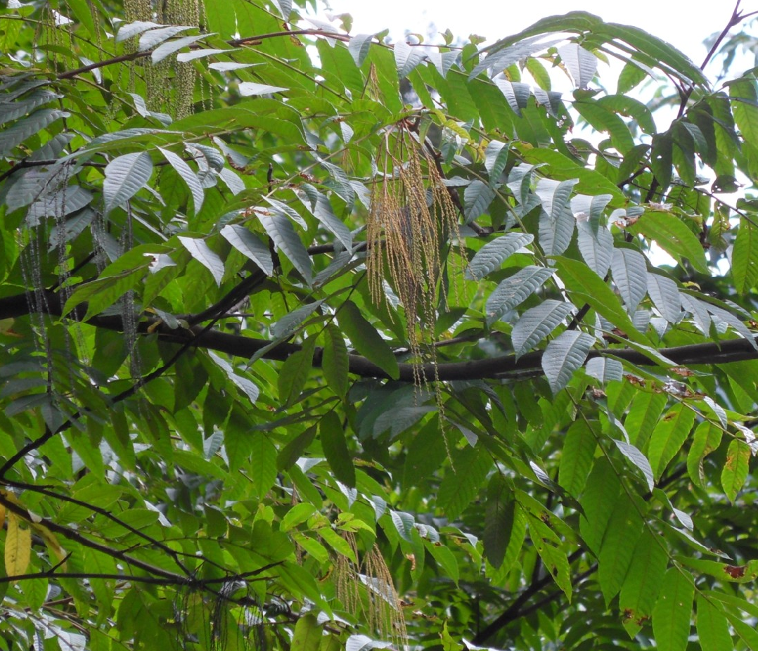 植物形态:落叶乔木,高约17米,胸径达40厘米;裸芽。幼嫩时,枝、叶、芽等均密被星形盾状腺鳞和短柔毛。奇数羽状复叶互生,长15-30厘米;小叶9-17,互生,厚纸质,被针形或斜长椭圆状披针形,长5-14厘米,先端渐尖,基部歪斜,边缘具锯齿;叶柄基部膨大;托叶叶状,早落。复圆锥花序腋生,下垂,长达32厘米;花杂性,同株,无柄,常3朵集成二歧聚伞花序,中间为两性花,两侧为雌花;花被片4,覆瓦状排列;雄蕊6,分离;子房上位,2室,柱头二。小坚果卯圆形,微扁,周围具膜质薄翅,翅端2裂。