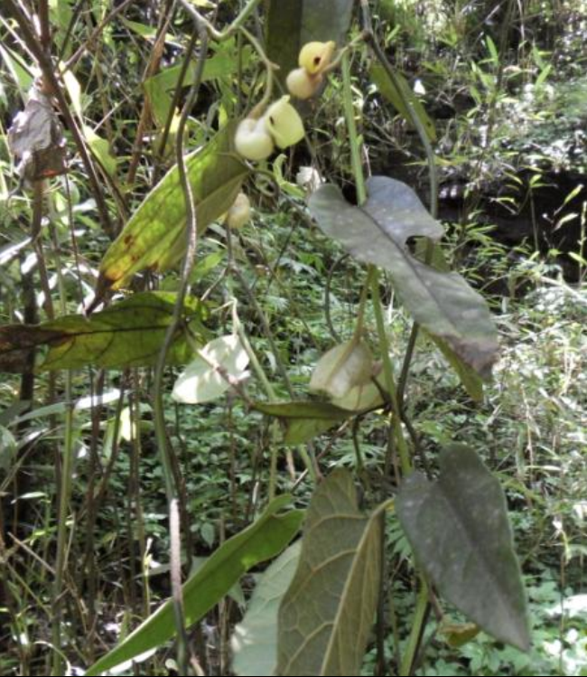 植物形态:多年生缠绕草质藤本。根圆柱或纺锤形。茎柔弱,无毛。叶互生;叶柄长l-2厘米,柔弱;叶片卵状三角形、长圆状卵形或戟形,长3-6厘米,基部宽1.5-3.5厘米,先端钝圆或短渐尖,基部心形,两侧裂片圆形,下垂或稍扩展;基出脉5-7条。花单生于叶腋;花梗长l-1.5厘米;小苞片三角形,易脱落;花被长3-5.厘米,基部膨大呈球形,向上收狭成一长管,管口扩大成漏斗状,黄绿色,口部有紫斑,内面有腺体状毛;檐部一侧极短,另一侧渐延伸成舌片;舌片卵状披针形,顶端钝;花药贴生于合蕊柱近基部;子房圆柱形,6棱;蒴果近球形,先端圆形而微凹,具6棱,成熟时由基部向上沿空间6瓣开裂;种子扁平,钝三角形,边线具白色膜质宽翅。花期7-8月,果期9-10月。
