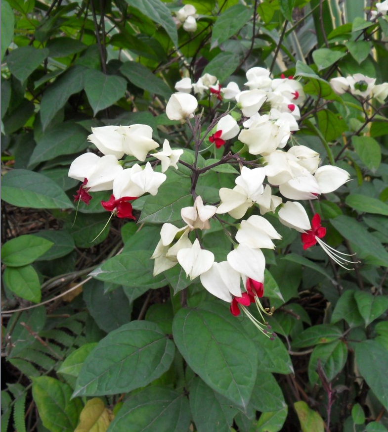 植物形态:多年生常绿藤本。株高2-5米,茎四棱;叶对生,深绿色,卵状矩圆形或卵形,长6-10厘米。宽4-7厘米,先端急尖,基部圆形,叶脉枝形,有短柄,边缘有细小钜齿或全缘;聚伞形花序顶生或腋生,呈疏散状,二歧分枝,花萼筒短,绿色,裂片白色,卵形,宿存,春夏开花,花美丽,萼白色较大、花冠上部深红色,花开时红色的花冠从白色的萼片中伸出,宛如龙吐珠,故名。花冠筒圆柱形,柔弱,5裂片深红色,从花萼中抻出,雄蕊及花柱很长,突出花冠外,花期春夏 。果实肉质球形,蓝色,种子较大,长椭圆形,黑色。