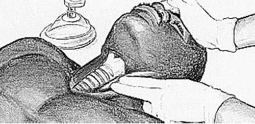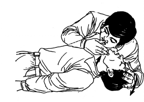 第二、人工呼吸:抢救者右手捏住病人鼻孔,左手托住病人下颌,将病人口唇张开,急救者深吸气后紧贴病人口部用力吹气,病人胸廓升起为有效;放松捏住鼻孔的右手,病人胸廓复原,并感到病人口鼻有气呼出为有效。(每分钟均匀重复吹气16次)