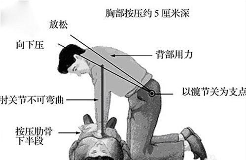 第三、胸外按压:这是现场急救最实用有效的抢救方法,使病人仰卧地上或背部垫一块木版。抢救者用一手的掌根部按在病人胸骨下段,另一手压在该手上,肘关节伸直,利用体重和肩臂力量垂直向下用力挤压,使胸骨下陷3~4厘米,略作停顿后在原位放松,手掌根部不要抬起。按压次数每分钟60~80次:单人急救(按压15次,吹气2次),两人抢救(按压4~5次,吹气1次)。