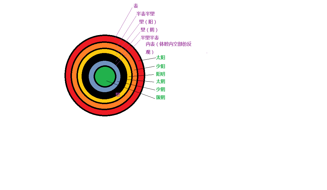 大概图示:(原则上,太极立法是立体活动的,不受时空性,但历代似乎将太极图一些法理看成了平面化,变成了死规则,六气划分法错套的现象并不少见。下图是按太极一些法理原理画的,具体上与人体结合还是很粗糙,比如传经上先从太阳,次阳明,再少阳,说明人体的结构在大自然界是不完全与大太极保持一致,小范围内是有个性化的现象存在,也许这就是太极的变数,即后天一气变动万法化生的立基石,没有此一变,如完全统一则是先天,法则规矩不能用后天法则去套。)